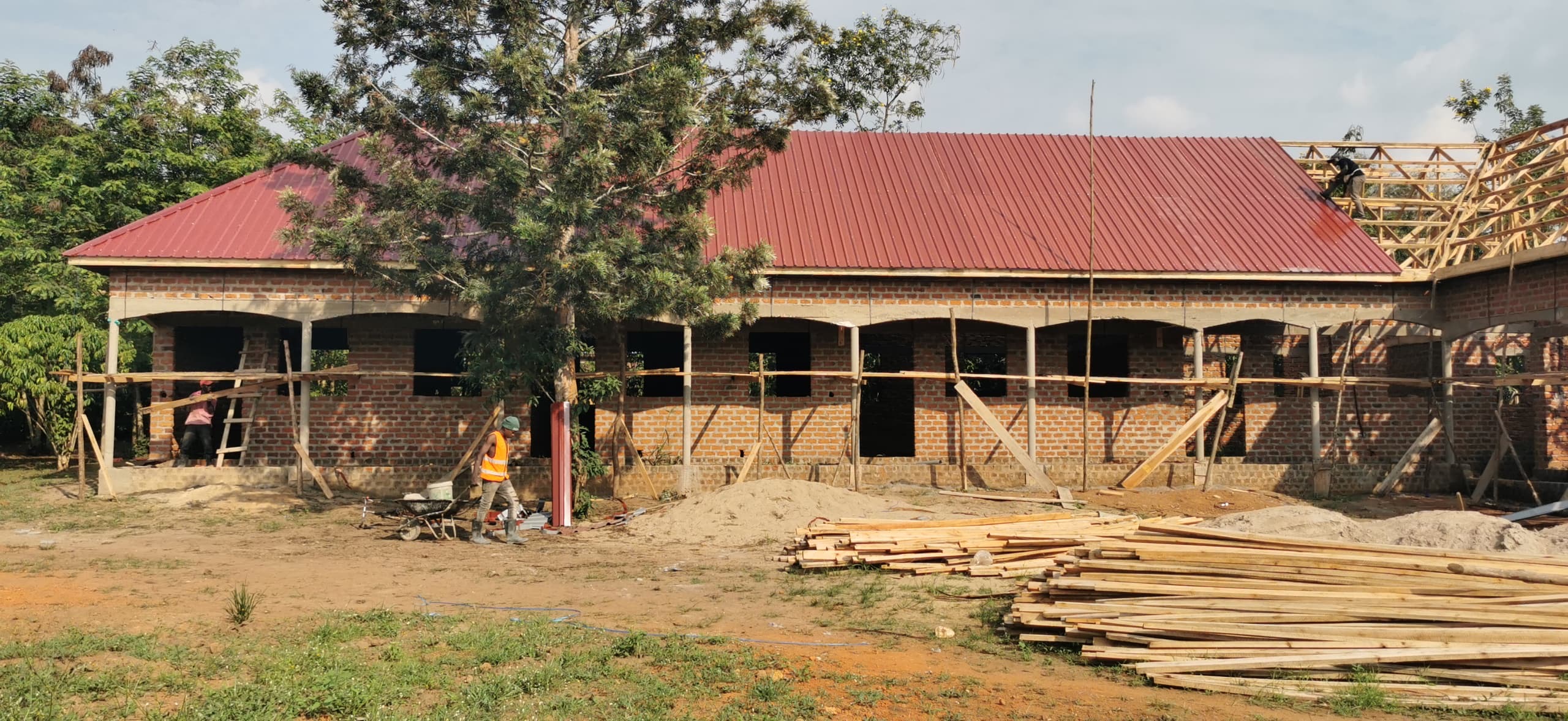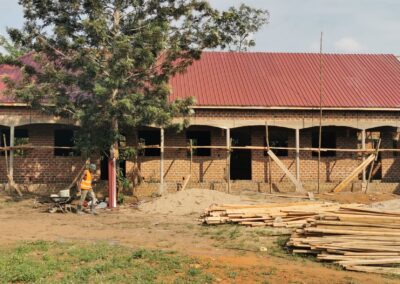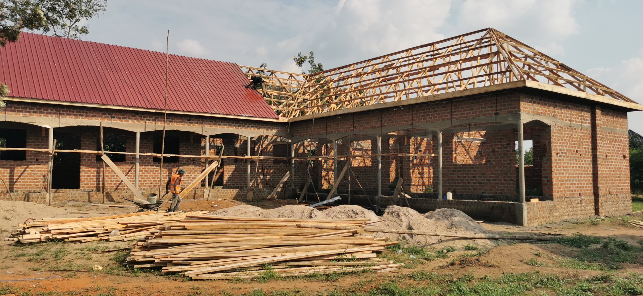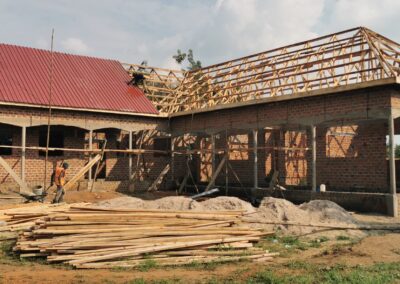 Die Dachkonstruktion hat begonnen. Wir freuen uns sehr zu sehen, wie dieses Gebäude immer mehr an Gestalt annimmt. In wenigen Monaten wird dort die Vorschule einziehen und die Internatsräume werden dann ebenfalls bezogen.